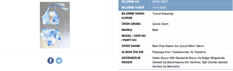 Aynı zamanda ‘Badr’ markalı baskılı kız çocuk bikini takımı için de toplatma kararı çıkarıldı.