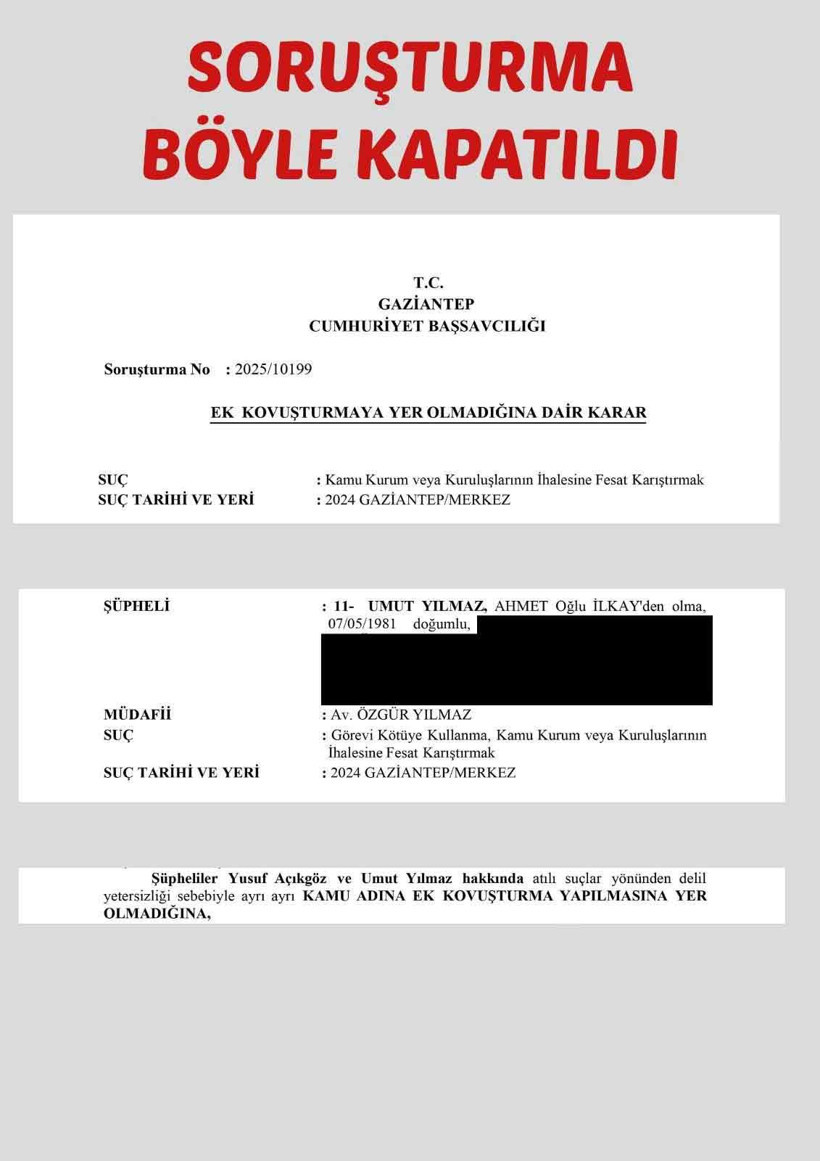 Soruşturma devam ederken Yılmaz yaklaşık 3 ay sonra 8 Nisan 2025’te kameralar karşısına geçerek CHP’den istifa ettiğini açıkladı. Gaziantep Cumhuriyet Başsavcılığı bu açıklamadan sadece 1 ay sonra 23 Mayıs 2025 tarihinde dosyayla ilgili önemli bir karar verdi. Başsavcılık, 14 şüphelinin bulunduğu dosyada sadece iki kişi hakkında “kovuşturmaya yer yoktur” kararı verdi. Bu iki kişiden biri Umut Yılmaz’dı. CHP’den istifa etmesinden çok kısa süre sonra Yılmaz hakkındaki soruşturma jet hızıyla kapatıldı.