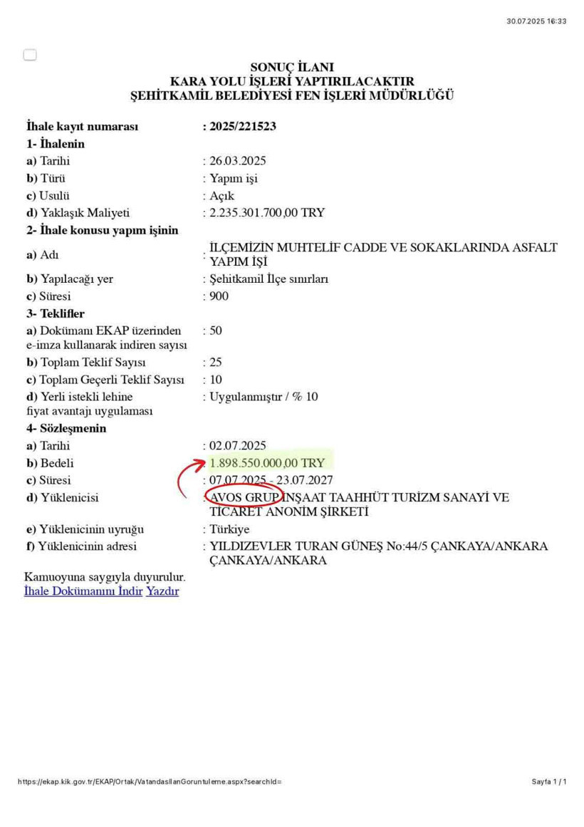 Umut Yılmaz’ın başkanlığındaki Şehitkamil Belediyesi, tartışmalı bir ihaleyle gündemde. Yılmaz CHP’den istifa ettikten sadece üç hafta sonra Şehitkamil Belediyesi Fen İşleri Müdürlüğü tarafından verilen 1 milyar 898 milyon TL’lik dev asfalt ihalesiyle ilgili çok ciddi usulsüzlük iddiaları ortaya çıktı. İhale belgelerini incelendiğimizde asfalt ihalesinin, en düşük bedeli veren şirkete değil, “fiyat dışı unsurlar” öne sürülerek, 4. sıradaki firmaya verildiğini görüyoruz. 26 Mart 2025’te açılan, 29 Nisan 2025 tarihinde sonuçlanan bu ihaleyle 194 milyon lira kamu zararı oluştuğu görülüyor. İş bitimine kadar fiyat güncellemeleri ile bu zararın 500 milyon lirayı bulabileceği tahmin ediliyor.