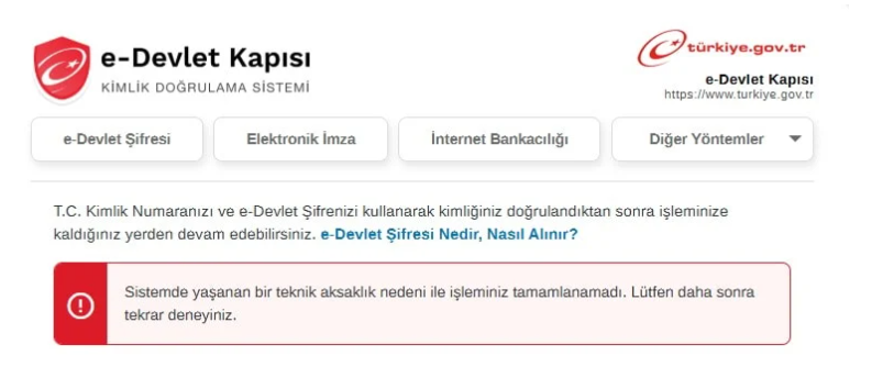 Sabah saatlerinden itibaren e-Devlet’e T.C. kimlik numarası ve şifreleriyle giriş yapmak isteyen kullanıcılar, “Sistemde yaşanan bir teknik aksaklık nedeni ile işleminiz tamamlanamadı. Lütfen daha sonra tekrar deneyiniz” bildirimiyle karşı karşıya kalıyor.