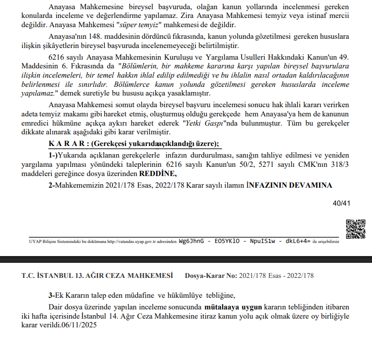 “Anayasa Mahkemesi somut olayda bireysel başvuru incelemesi sonucu hak ihlali kararı verirken adeta temyiz makamı gibi hareket etmiş, oluşturmuş olduğu gerekçede hem Anayasa’ya hem de kanunun emredici hükmüne açıkça aykırı hareket ederek “Yetki Gaspı”nda bulunmuştur.”