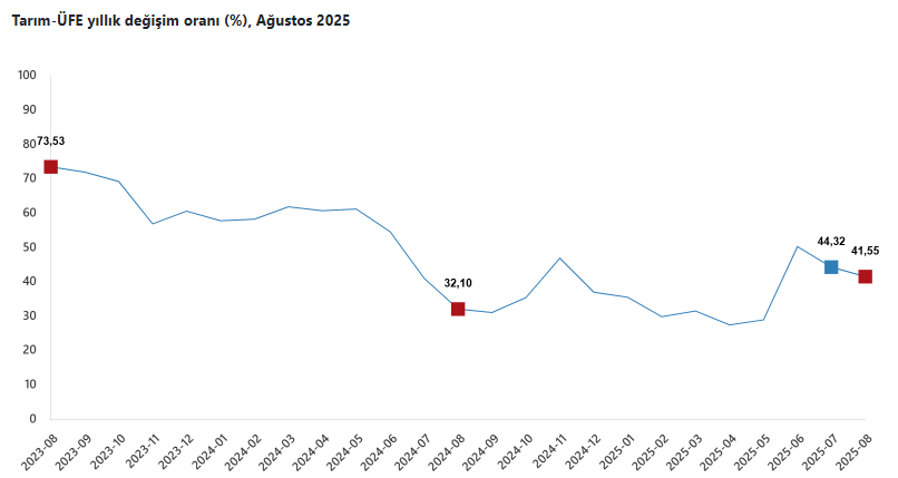 Türkiye İstatistik Kurumu (TÜİK), ağustos ayına ilişkin Tarım ÜFE verilerini açıkladı. Buna göre tarım ürünleri üretici fiyat endeksi (Tarım-ÜFE) yıllık yüzde 41,55 arttı, aylık yüzde 3,45 azaldı.