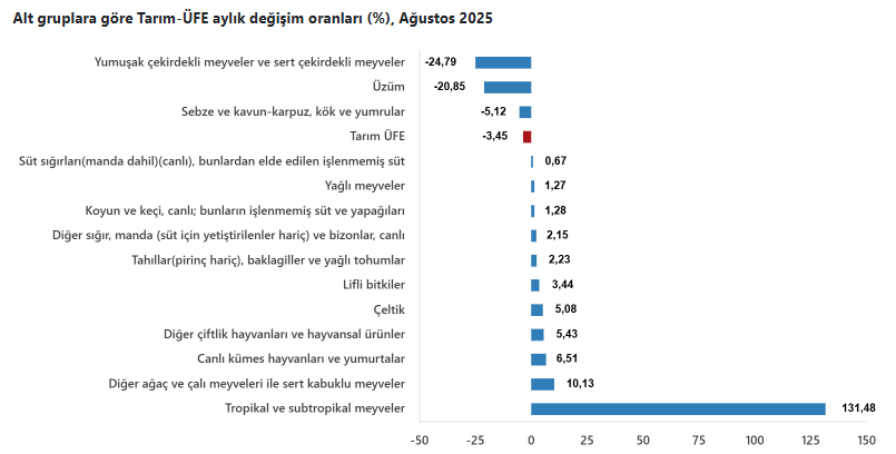 Tarım-ÜFE’de (2020=100), 2025 yılı Ağustos ayında bir önceki aya göre yüzde 3,45 azalış, bir önceki yılın Aralık ayına göre yüzde 21,83 artış, bir önceki yılın aynı ayına göre yüzde 41,55 artış ve on iki aylık ortalamalara göre yüzde 36,68 artış gerçekleşti.
