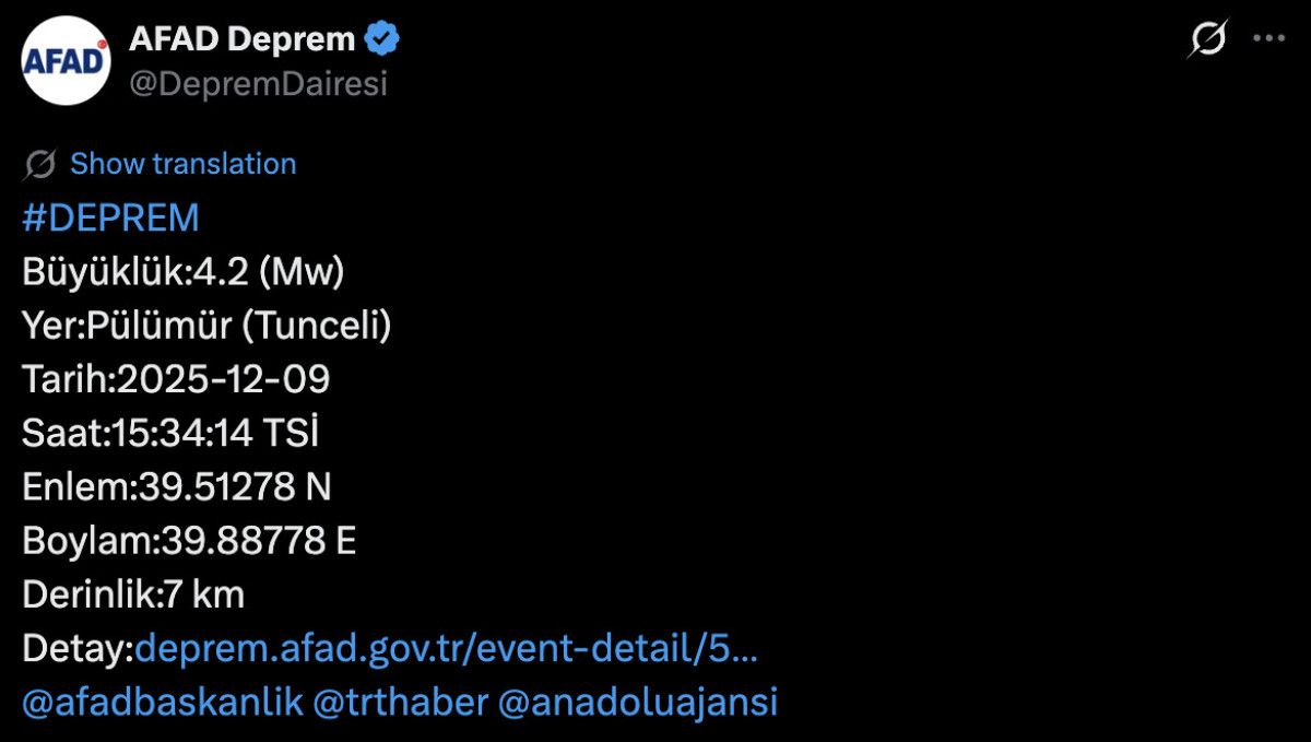 Tunceli’de 4.2 büyüklüğünde bir deprem meydana geldi.